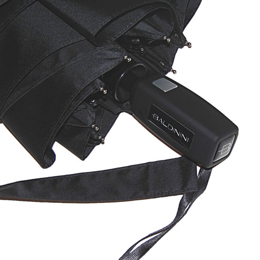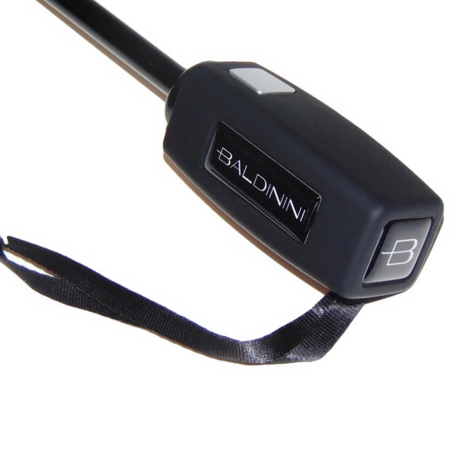Тефлоновая пропитка купола обеспечивает эффект " встряхни и зонт сухой", удобная прорезиненная ручка квадратной формы с серебристой кнопкой и боковой дизайнерской планкой с брендом "Baldinini" , гибкие комбинированные спицы из металла и карбона.