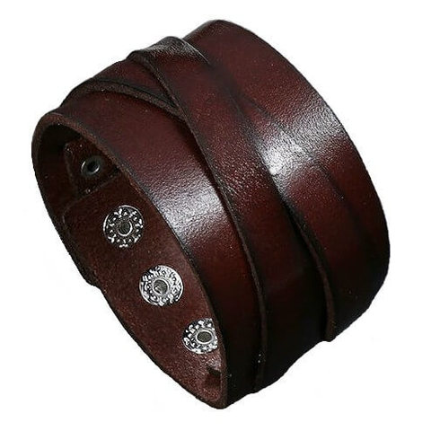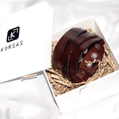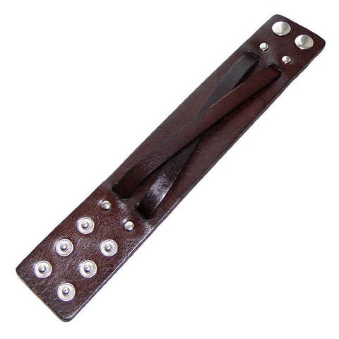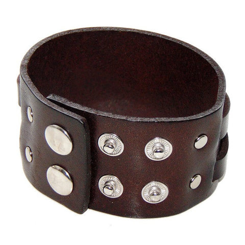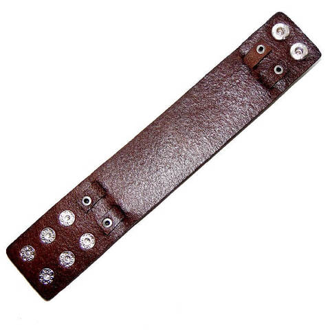 Широкий кожаный (натур,) браслет тёмно-коричневого цвета. Верхняя планка браслета состоит из двух перекрестных кожаных полос.