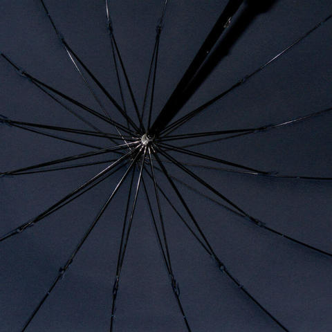 Эффектная модель в 16 спиц в магазине Зонтофф c большим и глубоким куполом темно-синего цвета. Рукоятка изготовлена из натурального цельного каштана гладкой текстуры и металлической планкой с брендом "Bugatti".