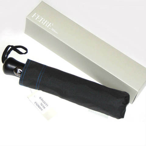 Модный итальянский зонтик с удобной ручкой из натуральной кожи. Эффектные детали подчеркивают современный дизайн, край черного купола прошит сплошной тёмно-синей нитью. Эффект "встряхни - и зонт сухой" обеспечивается тефлоновой водоотталкивающей пропиткой на куполе. Упакован в фирменную коробку FERRE Milano.