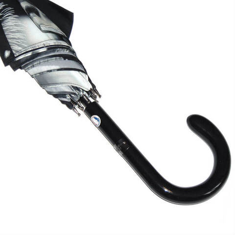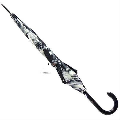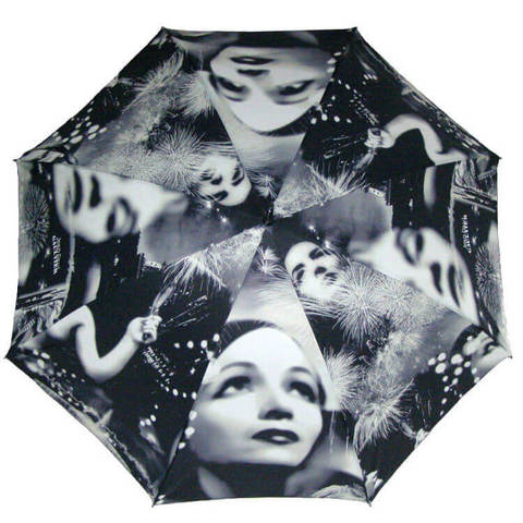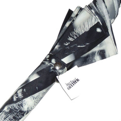 Дизайнерская коллекция JP Gaultier в магазине Зонтофф под названием "Great Сinéma", посвященная эпохе немого кинематографа. Винтажный стиль, отличного качества принт с изображением актрис черно-белого кино. Ручка в форме крюка черного цвета, брендированая металлической планкой " Jean Paul Gaultier", комбинированные спицы из стали и карбона (8 штук), длина спиц 120 см, диаметр под раскрытым зонтом 102 см.
