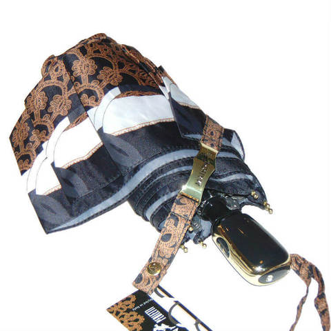 Изящный зонтик с рисунком золотистого кружева на куполе. Роскошное оформление деталей: металлическая планка золотого цвета с брендом "Maison Perletti " на хлястике, инкрустированный в рукоятку страз. Полный автомат, плоский при сложении, эффект "встряхни - и зонт сухой" обеспечивается тефлоновой водоотталкивающей пропиткой на куполе. Модель очень компактная и легкая для своей категории. Прилагается брендовая упаковка.