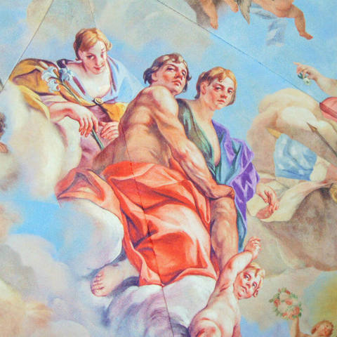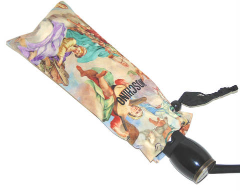 Изысканный зонтик нового сезона из коллекции Moschino Boutique. Изящные итальянские фрески на куполе.Ткань качественно пропитана водоотталкивающим средством (встряхни- и зонт сухой), не выгорает, зонт с полной автоматической системой открытия и закрытия (полный автомат), оснащен системой антиветер, удобная черная ручка с металлическим диском на тыльной стороне с гравировкой "BOUTIQUE MOSCHINO".