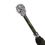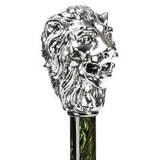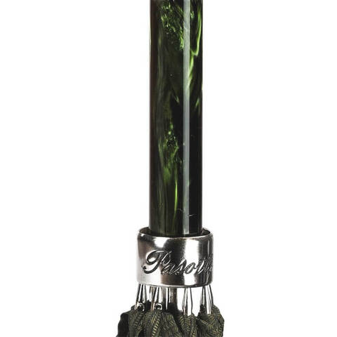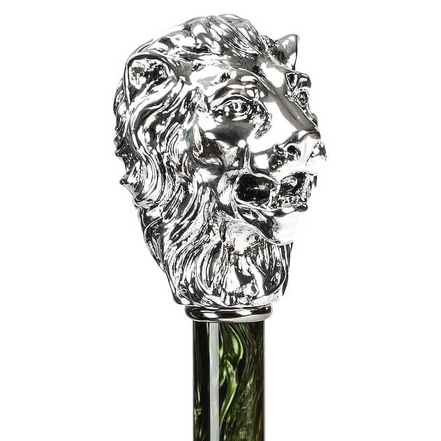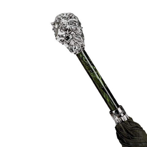 Роскошная дизайнерская ручка с перламутровым отливом черного изумруда, рукоятка изготовлена в форме головы льва c серебряным покрытием (натур.). Кажется что слышен мощный рык царя зверей. Спицы дополнительно фиксируются серебряным кольцом с гравировкой "Pasotti". Зонт для настоящих охотников и сильных мужчин.