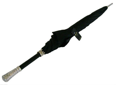 Классический мужской зонт-трость Pasotti, серебряная (натур.) дизайнерская ручка с орнаментом морских звезд и водорослей, ручная работа. Купол шелковистой фактуры сетчатого плетения, спицы дополнительно фиксируются серебряным кольцом с брендом "Pasotti" .