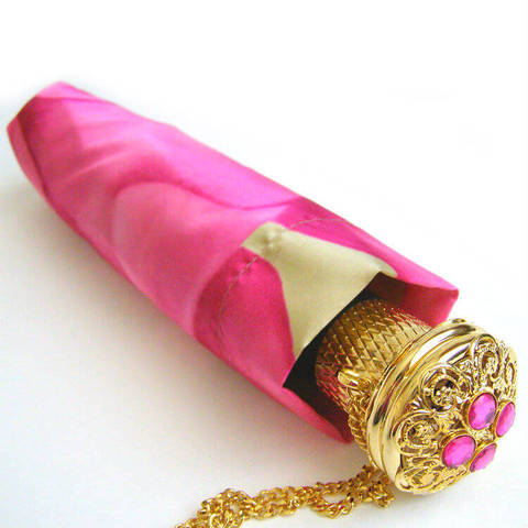 Изумительный женский зонтик ручной работы в магазине Зонтофф, шелковистый купол с изображением нежного раскрывшегося пиона, дизайнерская ручка в виде золотого цветка с камнями.