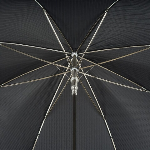 Классический мужской зонтик ручной работы в магазине Зонтофф, великолепный дизайн ручки в виде головы орла, cеребряное (натур.) гальваническое покрытие, спицы дополнительно фиксируются серебряным кольцом с брендом "Pasotti". Купол черного цвета.