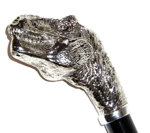 Эксклюзивный зонт ручной работы из новой коллекции Pasotti. Купол выполнен из высококачественной ткани в мелкое плетение глубокого черного цвета. Необычная дизайнерская ручка в виде головы тиранозавра с серебряным гальваническим покрытием.