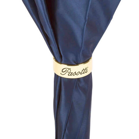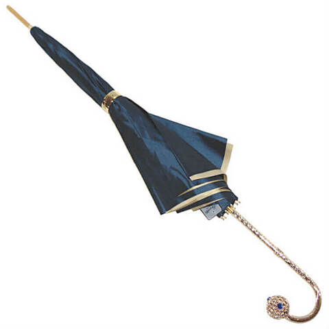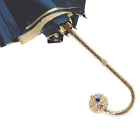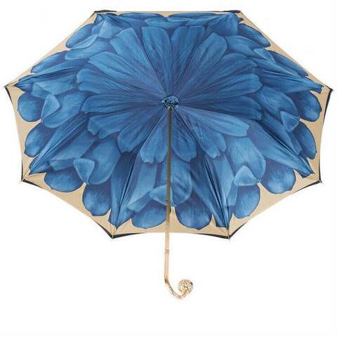 Роскошный женский зонт-трость в магазине Зонтофф, ручная работа, двухслойный шелковистый купол. Верхний слой однотонный атласный тёмно-синего цвета, внутри зонтик раскрывается удивительным дизайнерским рисунком - синим георгином на бежево-золотистом фоне. Купол закрывается на фирменное кольцо Pasotti золотого цвета. Дизайнерская ручка оформлена в виде золотого шара с прозрачными синими камнями, золотое кольцо с гравировкой "Pasotti".