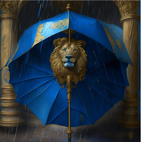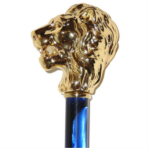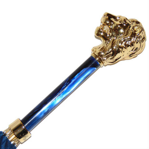 Эксклюзивный зонт ручной работы с великолепной ручкой в виде головы льва и классическим синим куполом. Роскошная дизайнерская ручка с перламутровым синим отливом, рукоятка изготовлена в форме головы льва с гальваническим покрытием из золота(натур.). Кажется что слышен мощный рык царя зверей. Спицы дополнительно фиксируются кольцом с гравировкой "Pasotti". Зонт для настоящих охотников и сильных мужчин.