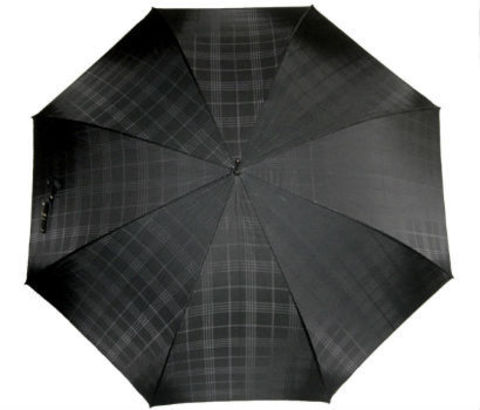 Элегантный мужской зонт Pasotti ручной работы c серебряным (натур.) покрытием на дизайнерской ручке в форме головы лабрадора. Классический черный купол в английскую крупную клетку за счет особого плетения нитей . Спицы при закрытии фиксируются подвижным серебряным кольцом, с брендом изготовителя "Pasotti".