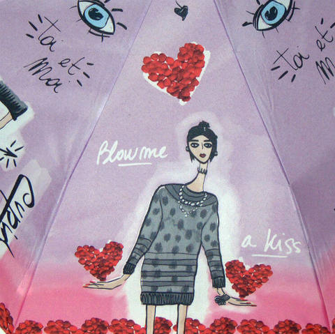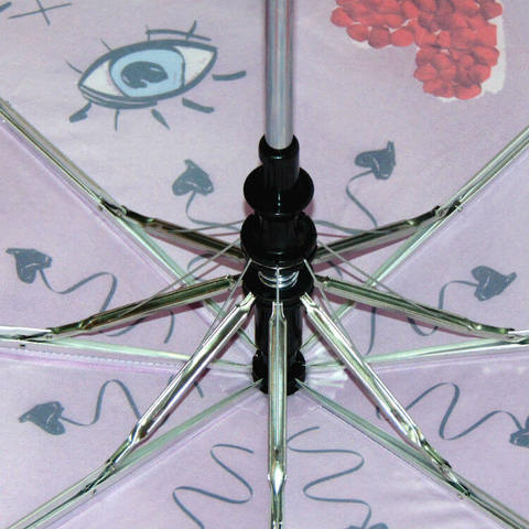 Нежный сиреневый зонтик с забавными картинками и пурпурными сердечками. Изящное оформление деталей, насыщенные краски, контрастная лиловая кнопка на черной ручке. Эффект "встряхни и зонт сухой" обеспечивается тефлоновой водоотталкивающей пропиткой на куполе.