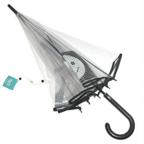 Актуальный тренд сезона - прозрачный зонт в магазине Зонтофф с веселым смайликом на куполе. Зонтик глубокий, закрывает плечи, имеет вытянутую в верх форму (колоколом), длина спиц 122 см., диаметр под куполом в раскрытом состоянии 89 см. Классическая черная ручка в форме крюка, комбинированные спицы из стали и карбона (8 спиц), длина зонта 87 см., система анти-ветер, полуавтомат. Очень легкий для своей категории всего 395 гр.