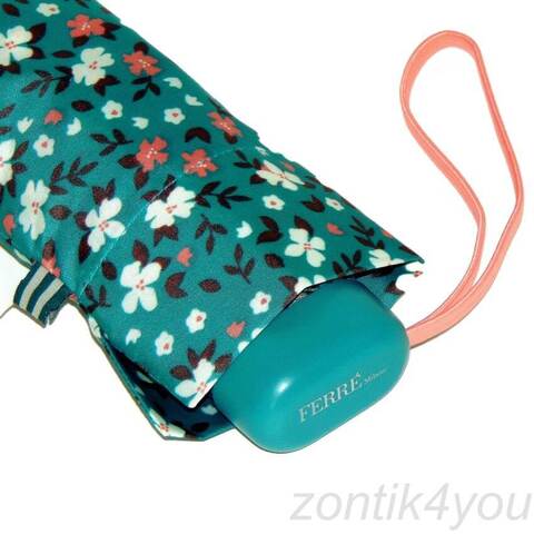 Тефлоновая пропитка против грязи и воды, такой плоский зонтик легко поместится в вашу сумочку, защитит не только от дождя но и от солнечных лучей. Плоская ручка брендирована надписью " Ferre Milano".