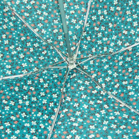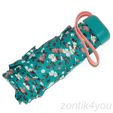 Женский маленький зонтик (механика), легкий и плоский при сложении. Миленький принт в цветочек на фоне насыщенного аквамарина. Контрастный розовый ремешок. Материал купола с защитой от УФ-лучей.