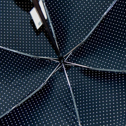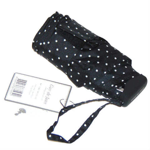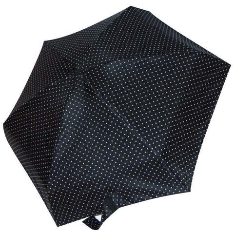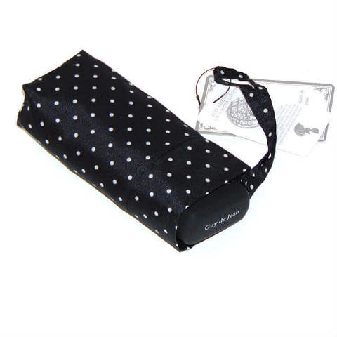 Чёрный купол в мелкий горошек в магазине Зонтофф. Не смотря на маленький размер, зонт имеет достаточно глубокий купол при раскрытии. Длина в сложенном состоянии всего 16 см., вес всего 190 гр, надежный металлический шток в 5 сложений, 6 спиц (металл + карбон), система анти-ветер, длина спиц 100 см., диаметр под раскрытым куполом 86 см. Тефлоновая пропитка от грязи и воды, зонтик легко помещается в дамскую сумочку, он не только защищает от дождя, но и отвечает современным модным трендам. Черная компактная ручка с французским брендом "Guy de Jean ".