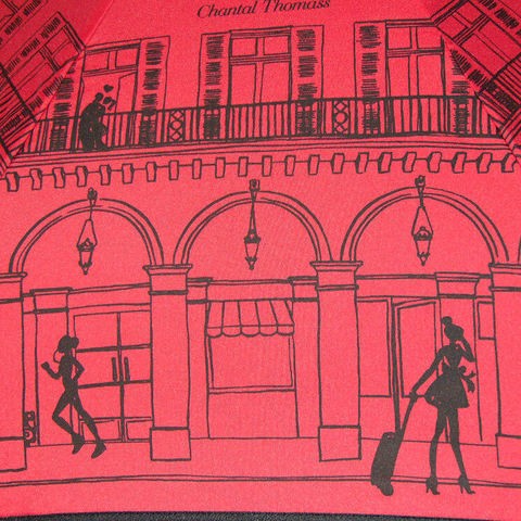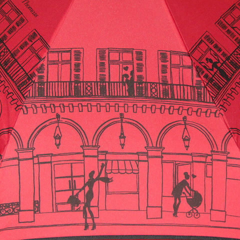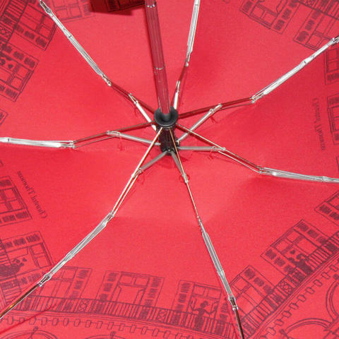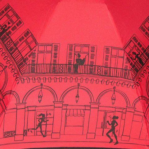 Яркий французский зонтик в магазине Зонтофф, полный автомат, красного цвета с контрастной графикой по куполу, легкие миниатюры из жизни девушек. Зонт может быть использован и от солнца, т.к. ткань имеет защиту от ультрафиолета "50+", протестирован в French Textile Institute.