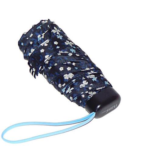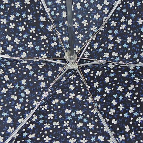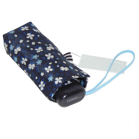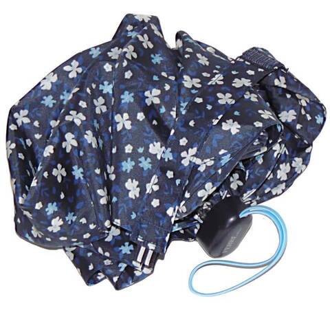 Женский зонтик мини формата, легкий и плоский при сложении. Механическая система раскрытия. Темно-синий купол с мелкими симпатичными цветочками. Светлый голубой ремешок, темно-синяя плоская ручка в тон купола. Зонтик не только защитит вас от дождя но и от солнца т.к. имеет защиту от УФ-лучей.