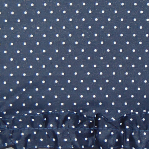 Классический принт в мелкий белый горошек, купол украшен кокетливыми рюшами, такой же стиль повторяется и на чехле зонтика.