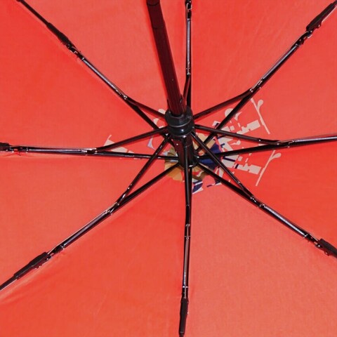 Яркий зонтик для женщин в магазине Зонтофф, полный автомат. Красный купол с эффектным принтом стилизованным из логотипа бренда, темно-синие и теплые карамельные тона приятно оттеняют принт на общем фоне. Удобная красная ручка в тон зонтика.