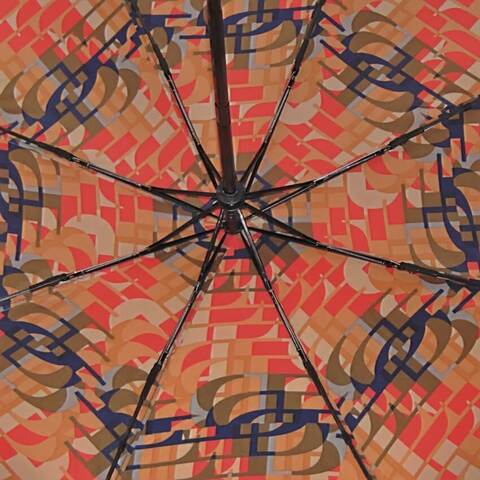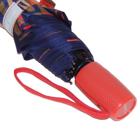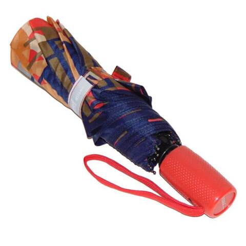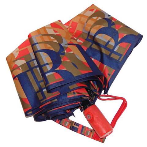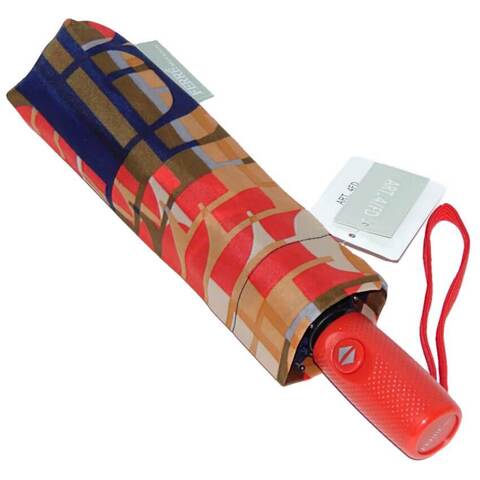 Разноцветный женский зонт в магазине Зонтофф, полный автомат. Яркий купол с эффектным принтом стилизованным из лого бренда Ferre, темно-синие, красные и теплые карамельные тона приятно оттеняют принт на общем фоне. Удобная красная ручка в тон зонтика.