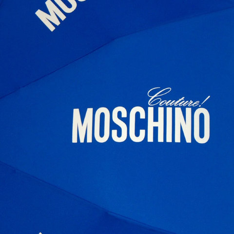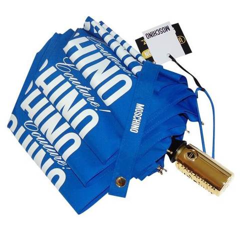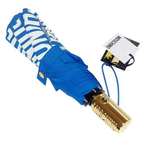 Васильковый яркий зонтик в магазине Зонтофф с контрастным белым принтом и дерзкой золотой ручкой из новой коллекции Moschino.