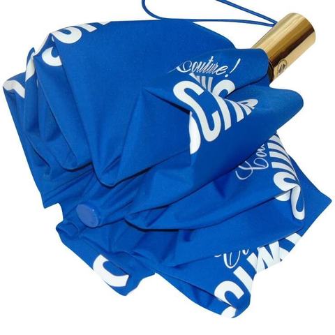 Яркий васильковый зонт с золотой ручкой от кутюр