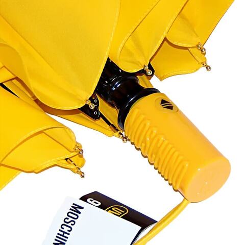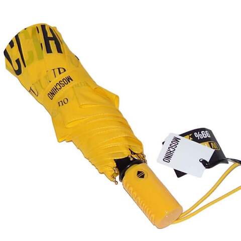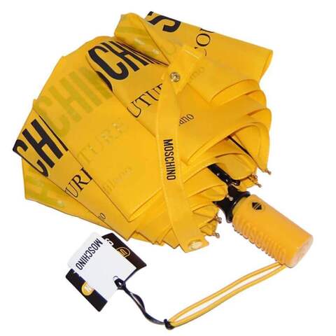 Яркий зонтик автомат от Moschino в магазине Зонтофф. Модный цвет этого сезона, насыщенный жёлтый. Эффектный дизайн - надпись "Moschini Couture" чередуется от контрастного черного до полупрозрачного. Удобная ручка в тон купола с выпуклым логотипом "Moschino".