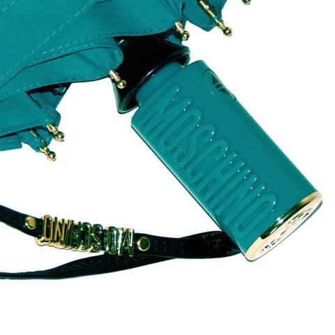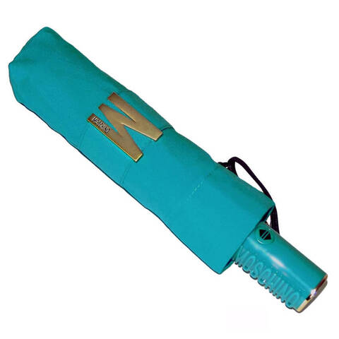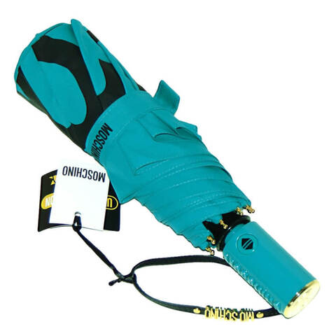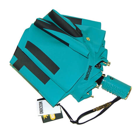 Яркий зонтик аквамарин от дизайнеров Moschino в магазине Зонтофф. Модный цвет этого сезона, черные контрастные буквы бренда на куполе. Эффектная ручка с выпуклым логотипом "Moschino" и золотыми подвижными Logo- буквами на кожаном ремешке. Золотая металлическая буква "М" на поясе чехла.