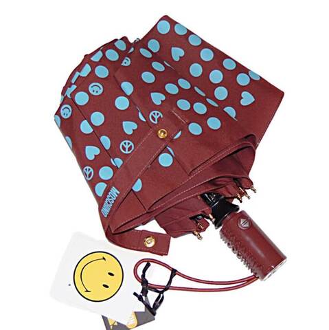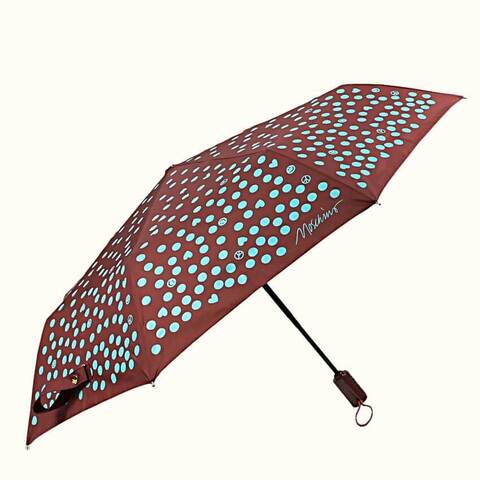 Купол уютного коричневого цвета с ярким контрастным принтом из голубых горошин, смайликов и сердечек. Зонтик прекрасно подчеркнет ваш позитив и хороший стиль в пасмурную дождливую погоду.