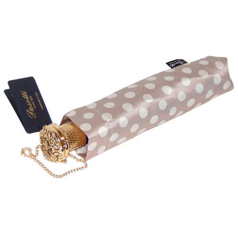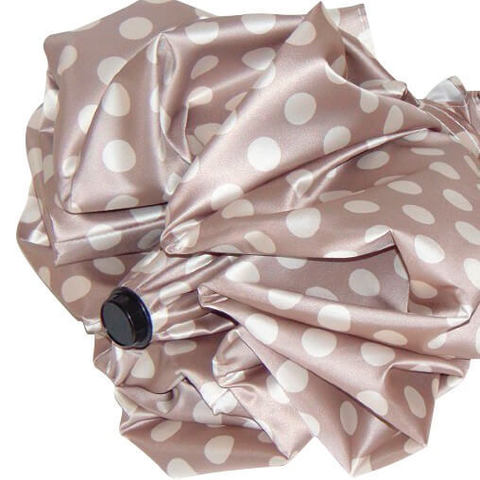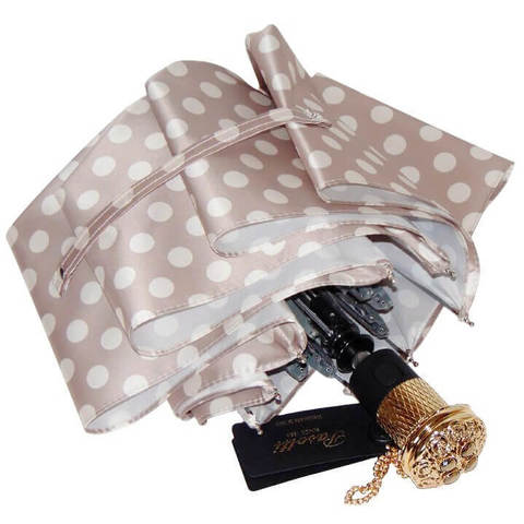 Нежный женственный зонтик ручной работы в магазине Зонтофф, шелковистый купол теплого перламутрового оттенка в белый горошек. Дизайнерская эффектная ручка в виде золотого цветка с прозрачными золотистыми камнями.