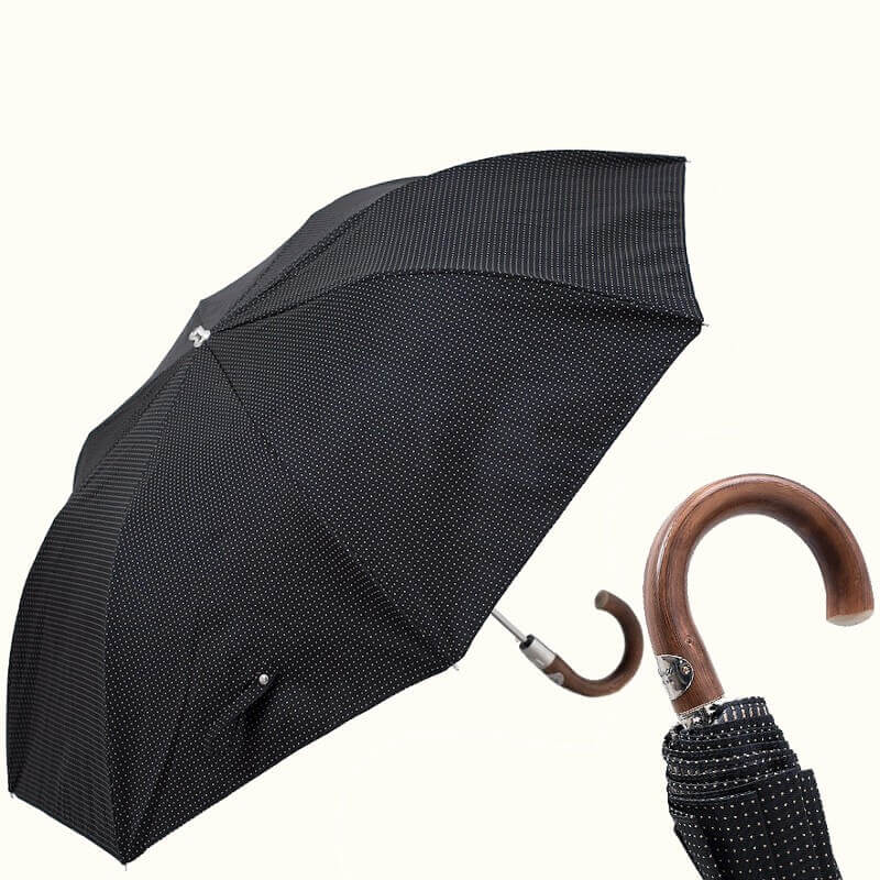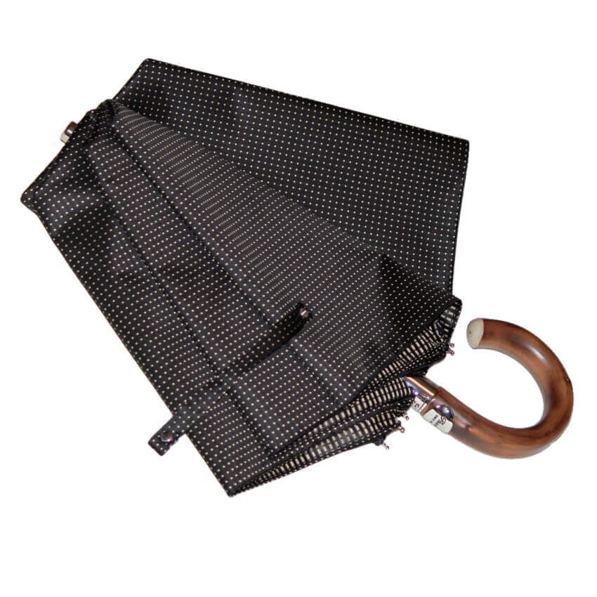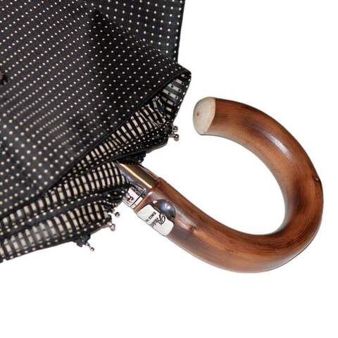 Зонт Pasotti – стильный аксессуар для мужчин. Модель VIP-категории выполнена вручную с использованием дорогих материалов: ручка сделана из благородного каштана, а купол – из эксклюзивной ткани «пункто» насыщенного оттенка горького шоколада, украшенной золотой строчкой.