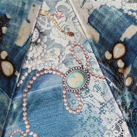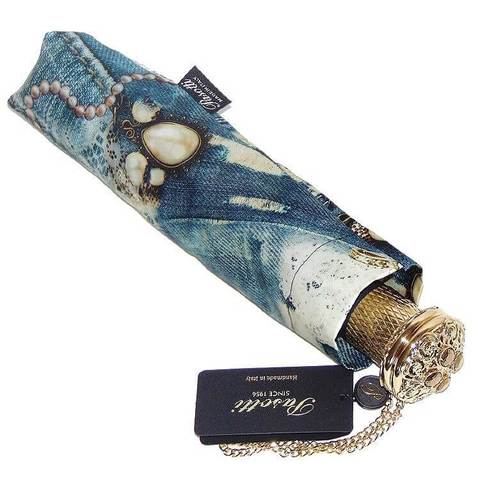 Роскошный стиль -эклектика, женский зонтик ручной работы из новой коллекции Pasotti в магазине Зонтофф. Зонт выполнен в эффектном винтажном принте. Изящное сочетание кружев, розового жемчуга и камеи на джинсовом фоне, основной цвет- индиго.