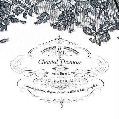 Самый известный аксессуар от дома Шанталь Тома - "Imprimé 211 rue St Honoré" в магазине Зонтофф. Это фирменный зонтик с адресом центрального бутика Chantal Thomass, культовая французская модель. Ручная работа, купол пошит из двух контрастных тканей. Верхний слой-однотонный черный, а, нижний - с прекрасным принтом из черного кружева на бежевом нежном фоне. Глубокая форма хорошо закрывает плечи.