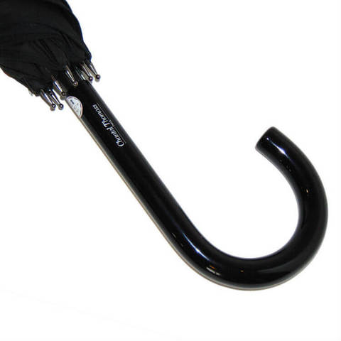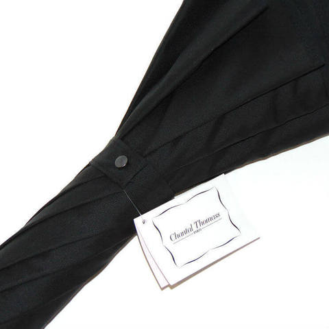 Шток зонта изготовлен из легкого матового дерева, внутри него- стальной прочный стержень. Дизайнерская рукоятка удобной формы -крюк, покрыта черным глянцевым лаком, материал- облегченный карбоновый пластик. Рукоятка брендирована фирменной надписью "Chantal Thomass".