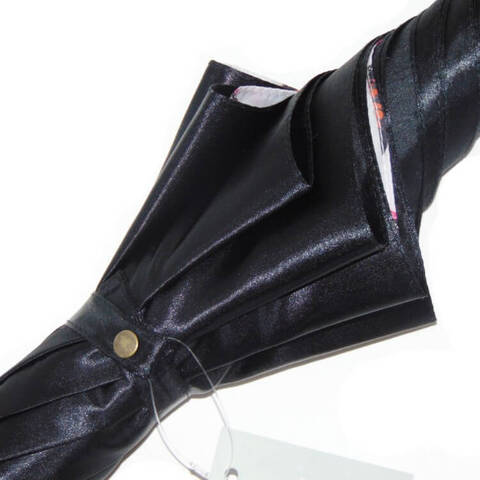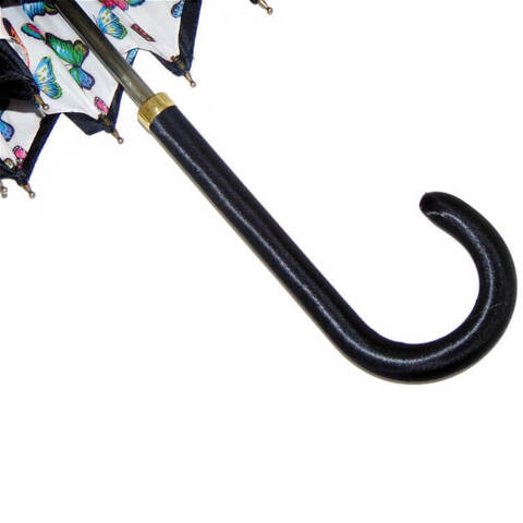 Изящный двухслойный зонт-трость ручного пошива. Атласный черный верх, а на внутреннем слое изображены яркие бабочки с легкой проекцией-"тенью", принт нанесен в технике 3D дизайна. Купол зонта качественно пропитан водоотталкивающим средством, ткань не выгорает, механика. Дизайнерская ручка-крюк с черным тканевым покрытием (ручная работа).