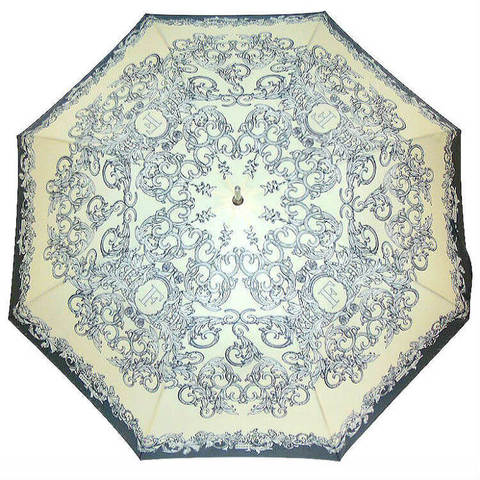 Роскошный женский зонт-трость от GF Ferre, удивительно нежный дизайн в стиле барокко, основной цвет купола сливочно-золотистый, удобная прорезиненная ручка. Материал купола с тефлоновой пропиткой против грязи и воды, не выгорает,(длина спиц 120 см., диаметр под раскрытым зонтиком 104 см.), полуавтомат, высота зонта -88 см.