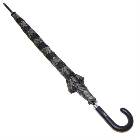Большой зонт-трость полуавтомат в магазине Зонтофф. Купол (полиэстер) в крупную тёмно-серую клетку, классическая шотладка. Удобная ручка в форме крюка покрытая перфорированной черной искуственной кожей(кожзам). Дизайн кожи напоминает оплетку автомобильного руля, у этого материала высокие эксплуатационные свойства, фактура, матовость и тактильные ощущения, как у натуральной кожи.