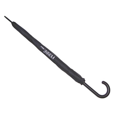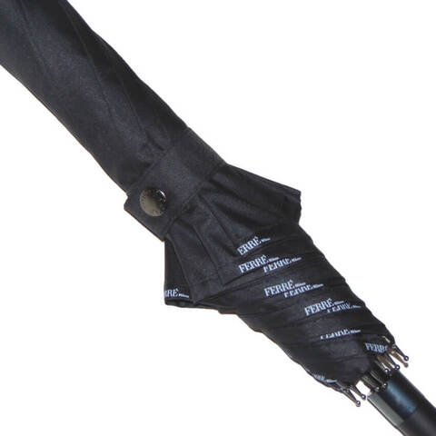 По краю купола нашита окантовка с брендированной надписью " Ferre Milano". Чехол и хлястик закрываются на кнопки. Удобная черная ручка - крюк из матового пластика, стальной наконечник на штоке. Тефлоновая пропитка купола обеспечивает эффект " встряхни и зонт сухой", комбинированные спицы из стали и карбона.