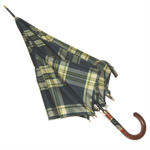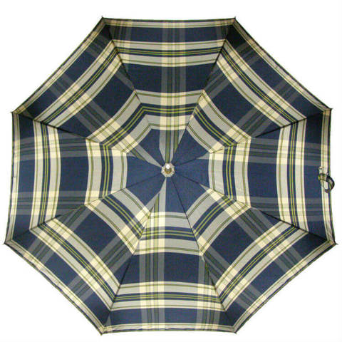 Изящная деревянная (натур.) ручка, вставки из клетчатой ткани в золотистом обрамлении и золотым кольцом для зажима спиц. Кольцо брендировано надписью "Guy de Jean". Купол в классическую британскую клетку, сине-золотистого цвета(длина спиц 120 см., диаметр под раскрытым зонтом 104 см.), тефлоновая пропитка ткани против грязи и воды, не выгорает, 8 карбоновых спиц, система анти-ветер. Чехол зонтика со специальными петлями для кожаного ремешка или цепочки, поэтому его можно носить на плече.