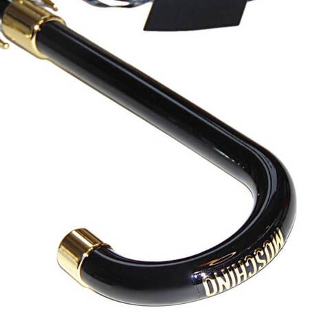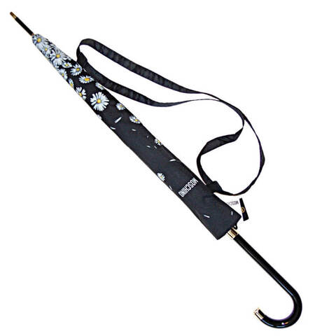 Глубокий купол в форме колокола надежно защитит ваши плечи, есть удобный чехол с лямками для носки на плече. Черная глянцевая ручка-крюк брендированная золотистыми буквами "Moschino".