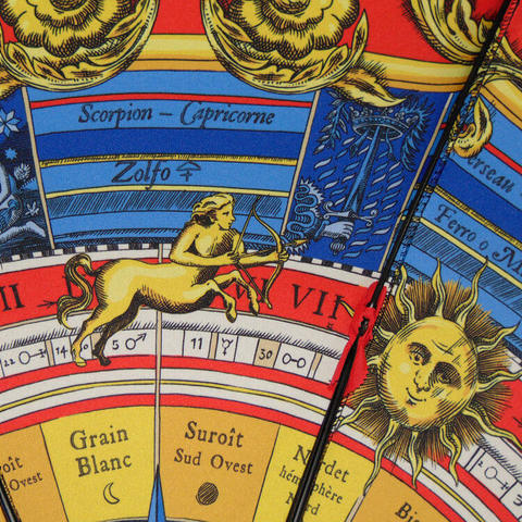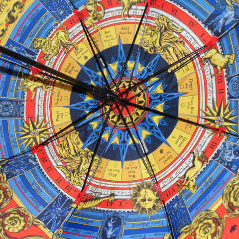 Женская коллекция Moschino Boutique. На внутреннем слое купола изображены знаки небесных светил и Зодиака, верхний слой изготовлен в однотонном черном цвете. Ткань купола (полиэстер) качественно пропитана водоотталкивающим средством - встряхни и зонт сухой, не выгорает. У зонта очень удобный чехол с лямками для ношения на плече. Оснащен системой антиветер, удобная чёрная ручка в форме крюка.