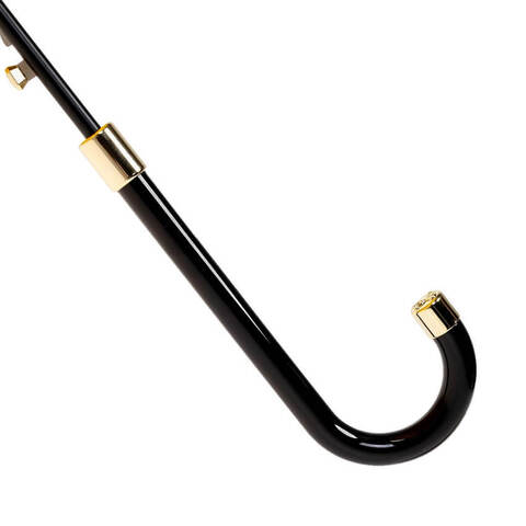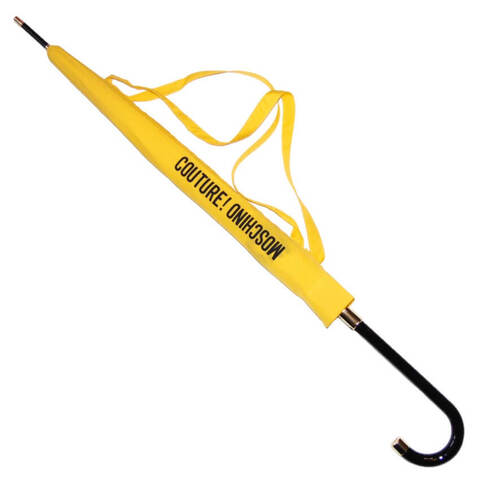 У зонта удобный чехол с лямками и глубокий купол в форме колокола, он надежно закроет ваши плечи. Черная глянцевая ручка - крюк с золотистыми металлическим оформлением и фактурным брендом "Moschino" на внешнем изгибе.
