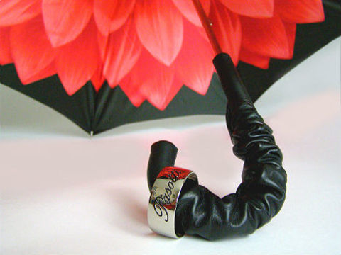 Роскошный женский зонт-трость, ручная работа, двухслойный шелковистый купол. Верхний слой однотонного чёрного цвета, внутри зонт раскрывается поразительной яркой красной астрой, дизайнерская кожаная ручка в стиле"шарпей" удобной изогнутой формы .