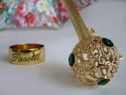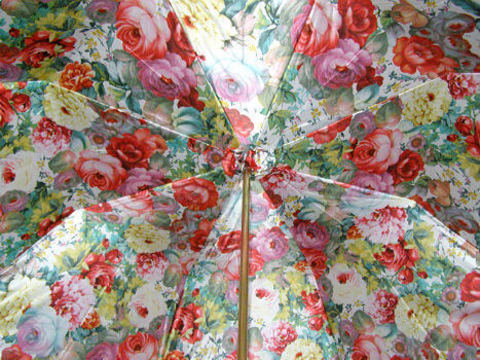 Роскошный женский зонт-трость, ручная работа, двухслойный шелковистый купол. Верхний слой однотонный атласный фисташкового цвета, внутри зонтик раскрывается удивительным дизайнерским рисунком - яркими садовыми розами. Купол закрывается на фирменное кольцо Pasotti золотого цвета. Дизайнерская ручка оформлена в виде золотого шара с прозрачными синими камнями, золотое кольцо с гравировкой "Pasotti".