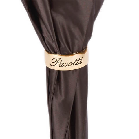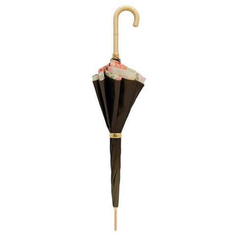 Букет из жёлтых роз внутри зонта из новой коллекции Pasotti в магазине Зонтофф, ручная работа. Женский зонт-трость выполнен в классическом стиле с кожаной ручкой - крюк золотого цвета. Двухслойный шелковистый купол. Верхний слой теплого шоколадного оттенка, внутренний с изящным принтом из желтых садовых роз. Купол сворачивается на фирменное кольцо Pasotti цвета золота.