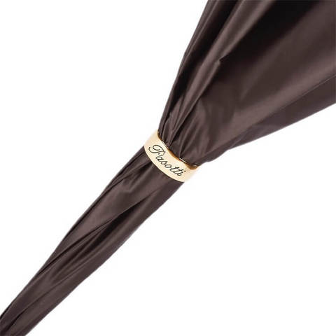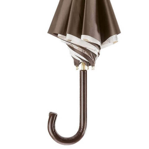 Роскошный женский зонт-трость Pasotti в стиле Hermès в магазине Зонтофф, ручная работа. Изящный принт из золотистых лент и уздечек, экипировки для верховой езды. Верхний слой купола в тёплом шоколадном цвете, фирменное золотое кольцо Pasotti. Удобная кожаная ручка с глянцевым покрытием что придает особую утонченность модели.