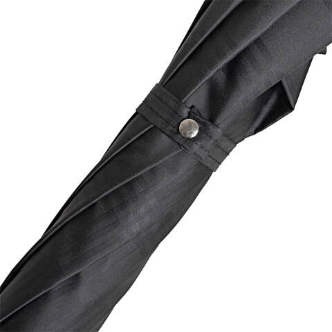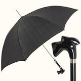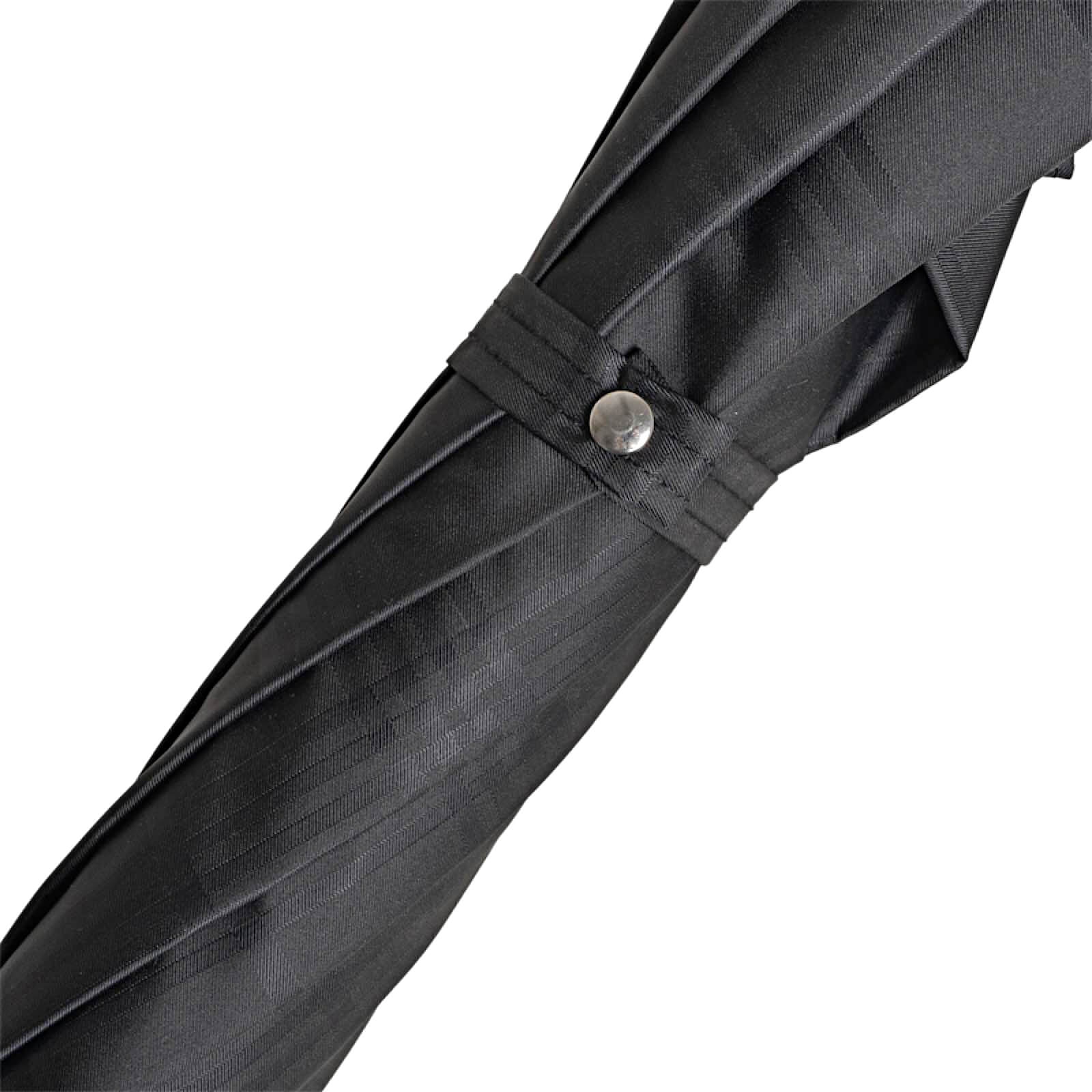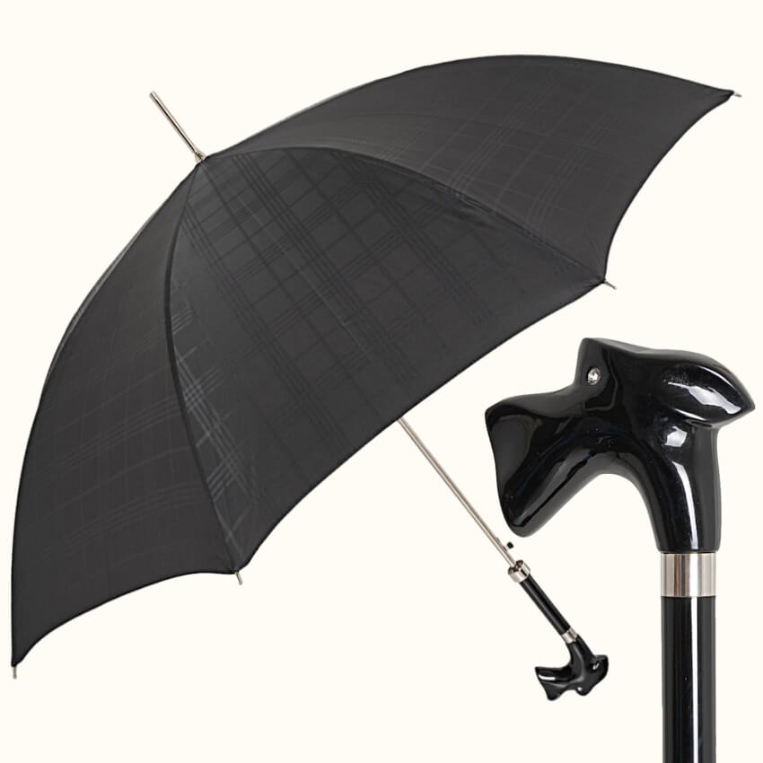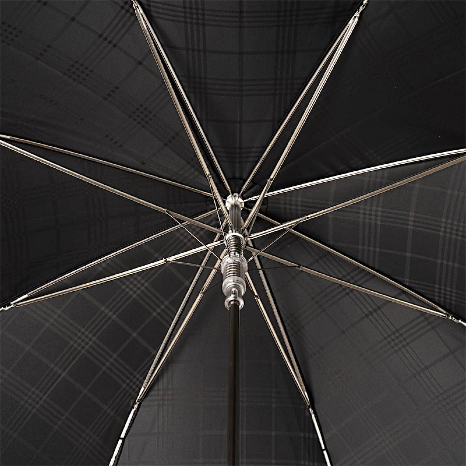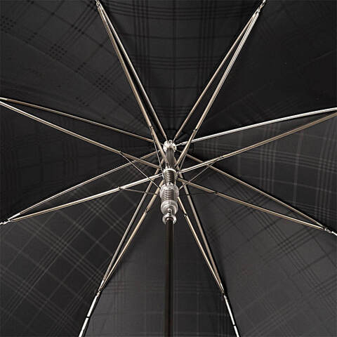 Купол зонта выполнен из дорогой черной ткани в крупную клетку за счет особого плетения нитей, обработан водоотталкивающим тефлоном. Спицы зонта закреплены серебряным подвижным кольцом с фирменным логотипом бренда Pasotti.