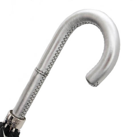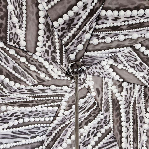 Серебряный женский зонтик из новой коллекции Pasotti в магазине Зонтофф, ручная работа. Кожаная серебряная ручка - крюк, двухслойный шелковистый купол. Верхний слой - серебристый деграде (перелив цвета), внутренний - с изящным принтом из белого жемчуга на темном леопардовом фоне. Купол сворачивается на фирменное кольцо Pasotti цвета серебра.
